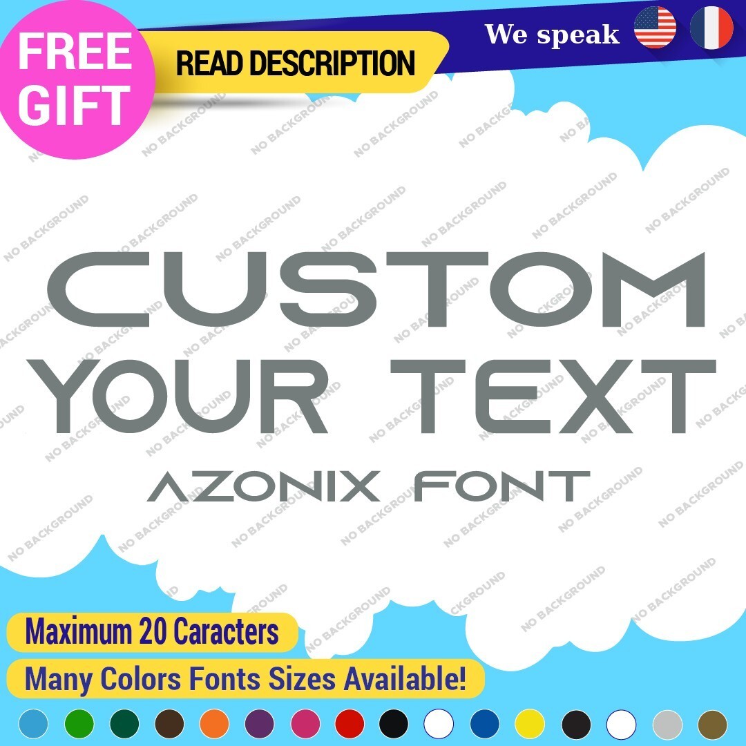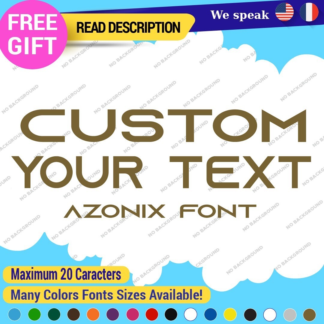 Introducing the Custom Text Name Azonix Fonts Lettering Die Cut Decal Vinyl Sticker 651, an exceptional product designed for individuals looking to personalize their vehicles or spaces with style. Priced between $8.65 and $11.65, this high-quality vinyl decal is made by Oracal, ensuring durability and a professional finish. The sticker features customizable options, allowing you to create a unique image or text that reflects your personality or brand. With a versatile application, it can be placed on various surfaces including bumpers, windows, and fuel tanks of cars, vans, motorcycles, and trailers. The material offers a selection of finishes such as glossy, matte, and metallic, and is available in a wide array of colors, including beige, black, blue, and more. Measuring up to 14 inches on its longest side, the decal is designed for easy application with its self-adhesive backing. Enjoy a five-year manufacturer warranty and transform your vehicle with this stylish, custom lettering solution.