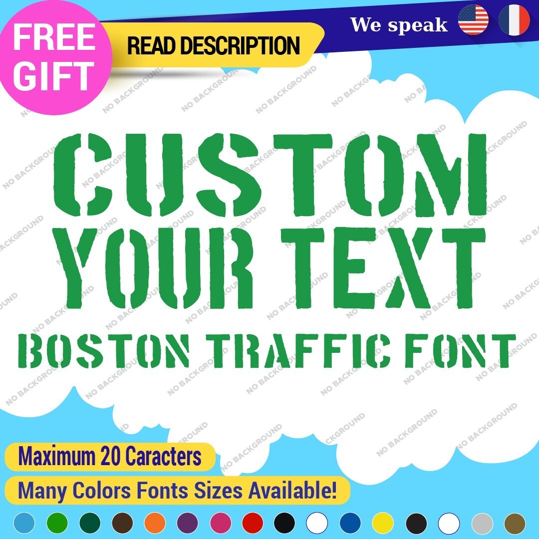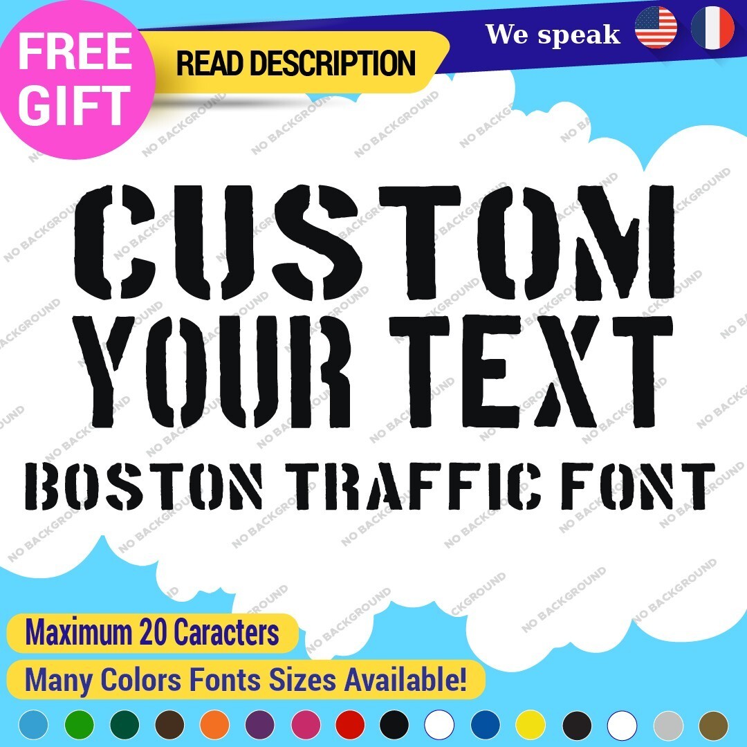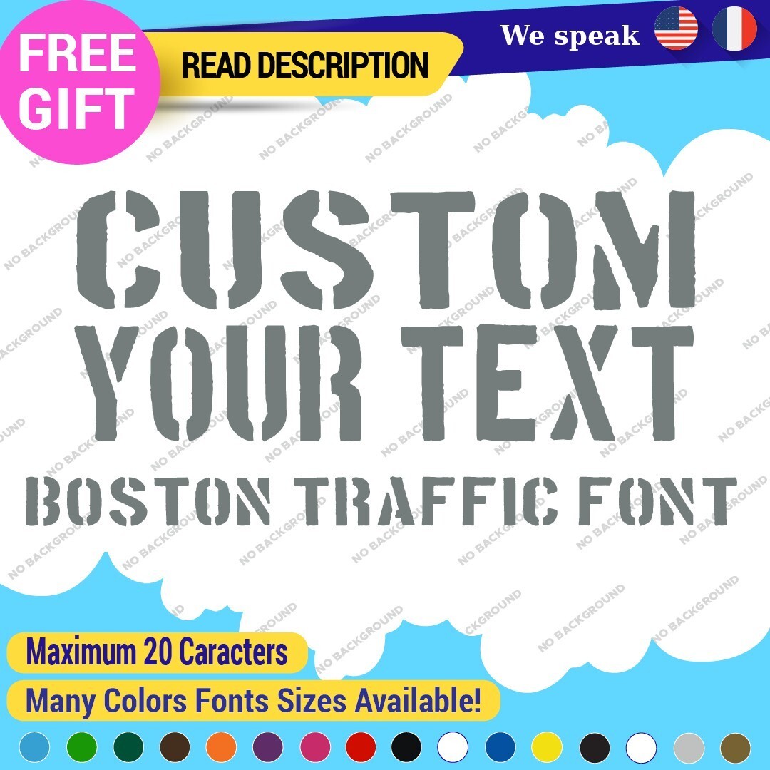 The Custom Text Name Boston Traffic Fonts Lettering Die Cut Decal Vinyl Sticker 651 is a versatile sign designed for personalized applications. Made from high-quality Oracal vinyl, it features custom text and images, ensuring a unique look. With a range of colors and finishes, it is suitable for various placements on vehicles and comes with a 5-year warranty. Priced between $8.65 and $11.65, this decal combines functionality with style for cars, caravans, and more.