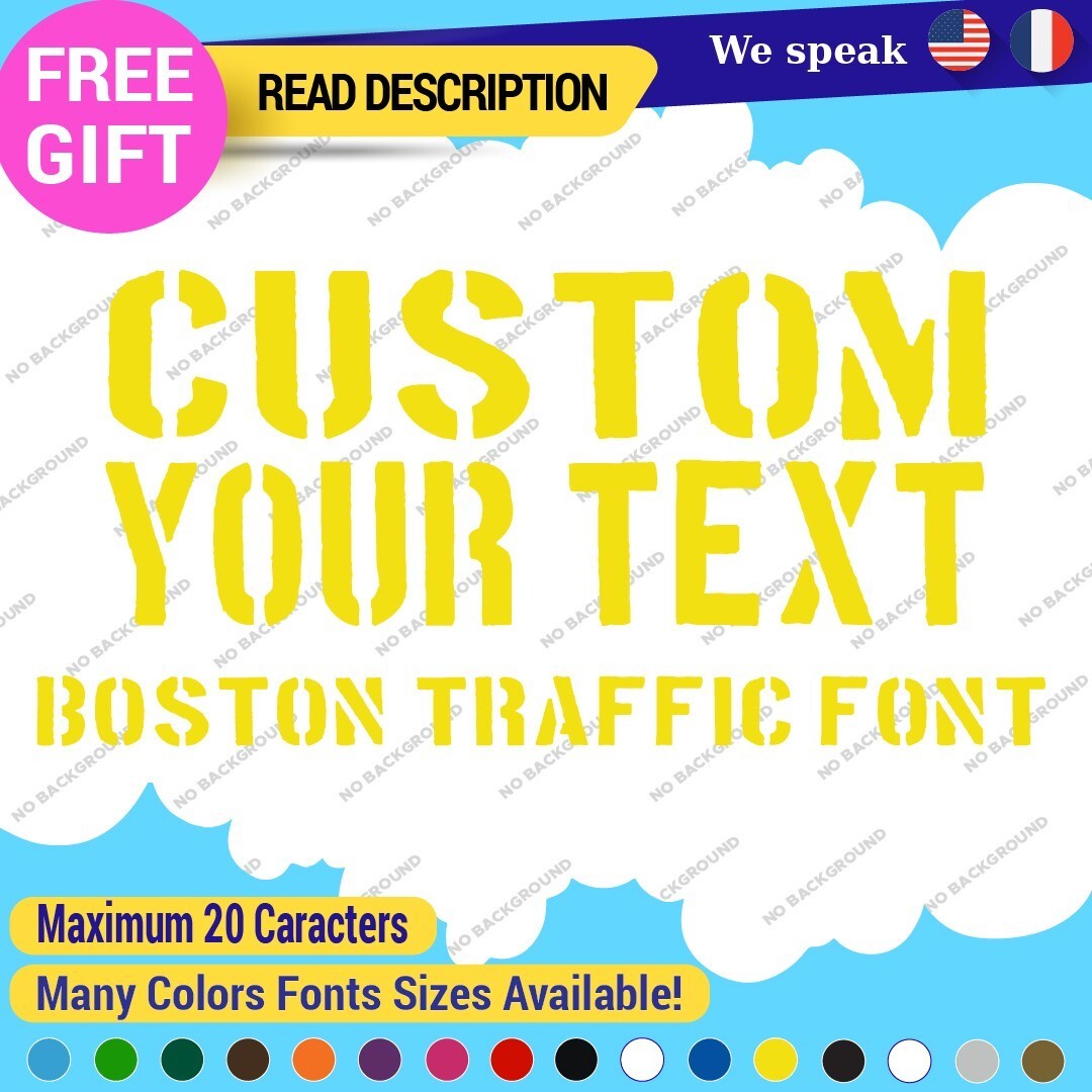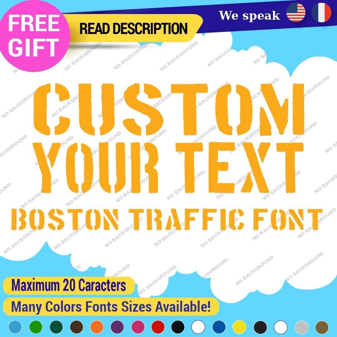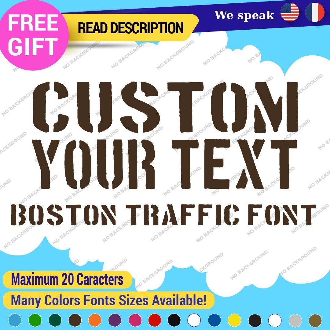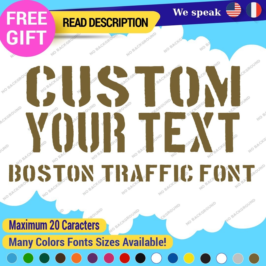 The Custom Text Name Boston Traffic Fonts Lettering Die Cut Decal Vinyl Sticker 651 is a versatile sign designed for personalized applications. Made from high-quality Oracal vinyl, it features custom text and images, ensuring a unique look. With a range of colors and finishes, it is suitable for various placements on vehicles and comes with a 5-year warranty. Priced between $8.65 and $11.65, this decal combines functionality with style for cars, caravans, and more.
