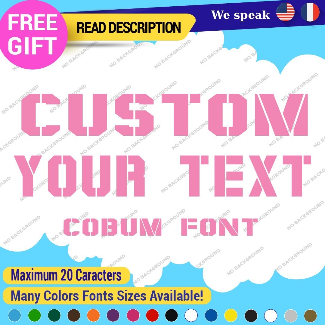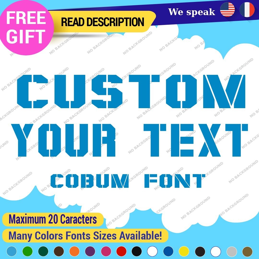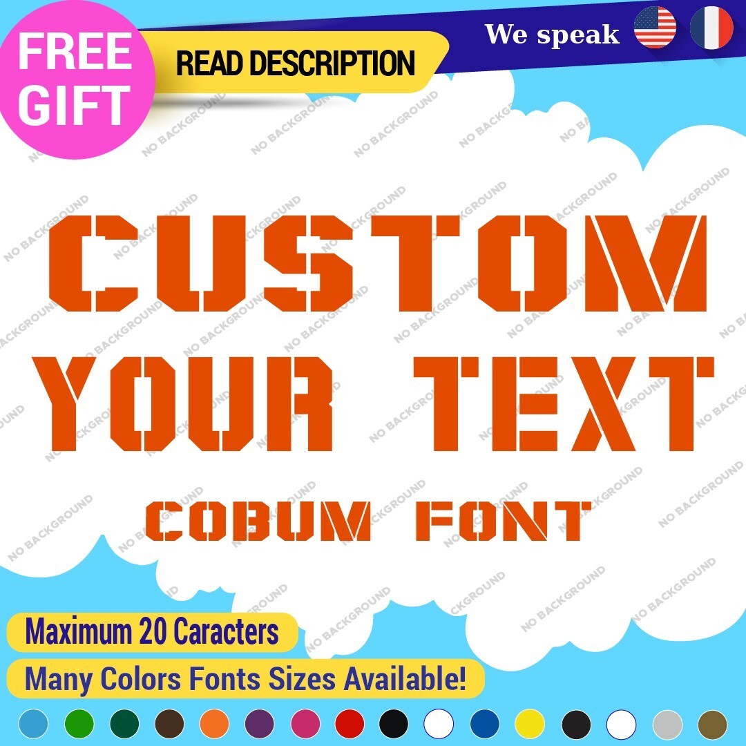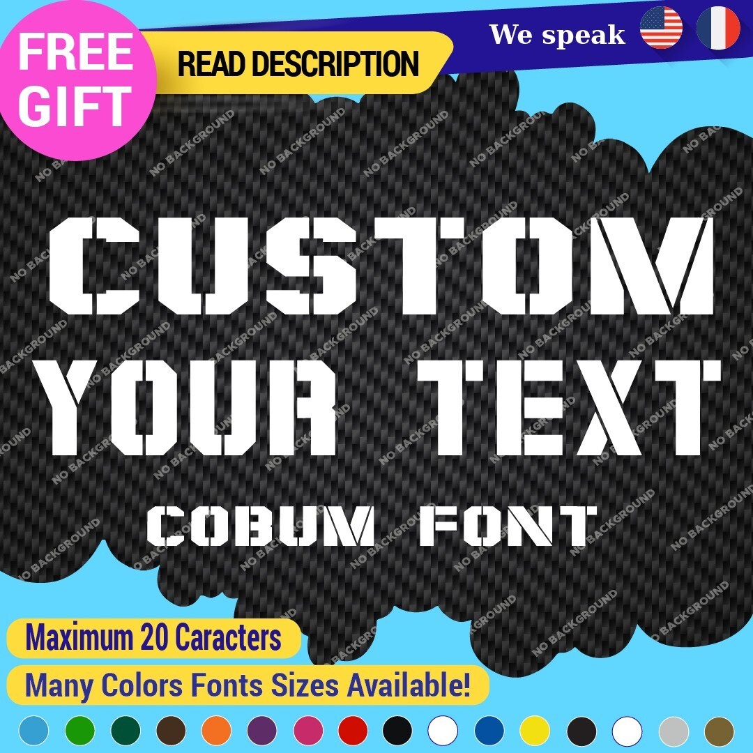 Introducing the Custom Text Name Cobum Fonts Lettering Die Cut Decal Vinyl Sticker 651, an exceptional addition to your signage needs. Priced between $8.65 and $11.65, this product offers remarkable value for a personalized touch. Crafted from high-quality Oracal vinyl, this decal is designed for durability and versatility, featuring a range of finishes including carbon fiber texture, glossy, matte, and metallic options. The die-cut design allows for custom images and text, making it ideal for personalizing vehicles, including cars, motorcycles, and trailers. With dimensions available up to 14 inches on the longest side, it fits a variety of placements such as bumpers, doors, and windows. The self-adhesive backing ensures a secure application, while the extensive color selection, from vibrant hues like red and blue to elegant metallics, allows you to tailor the decal to your style. Enjoy a 5-year manufacturer warranty, guaranteeing long-lasting satisfaction. Elevate your space with unique, customized lettering today.