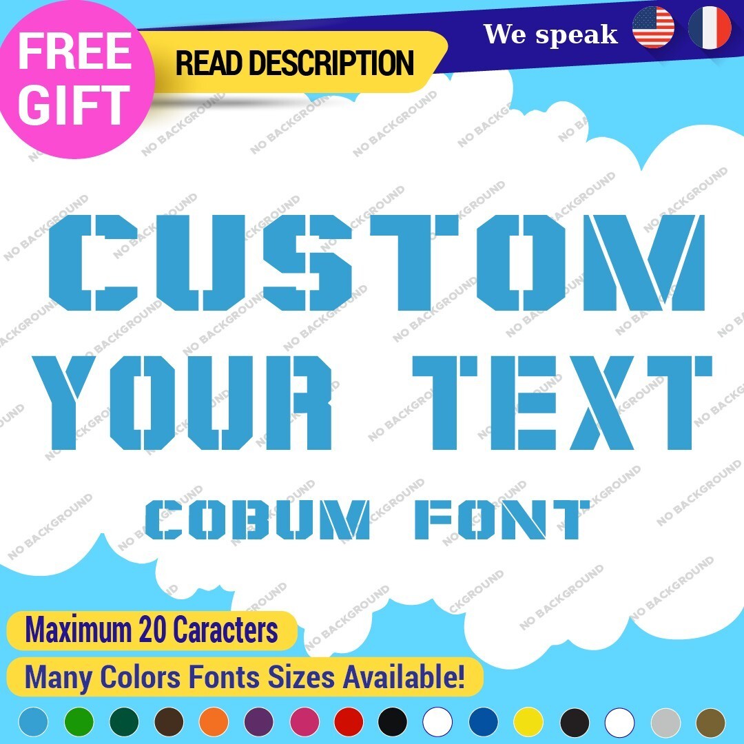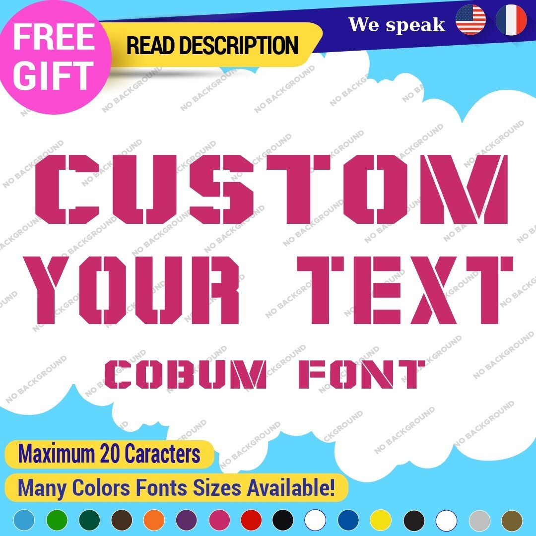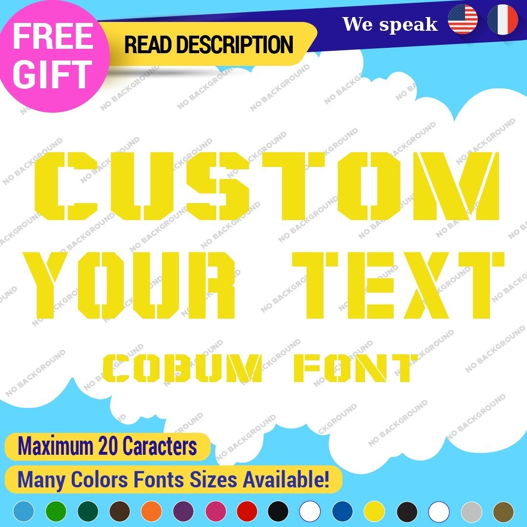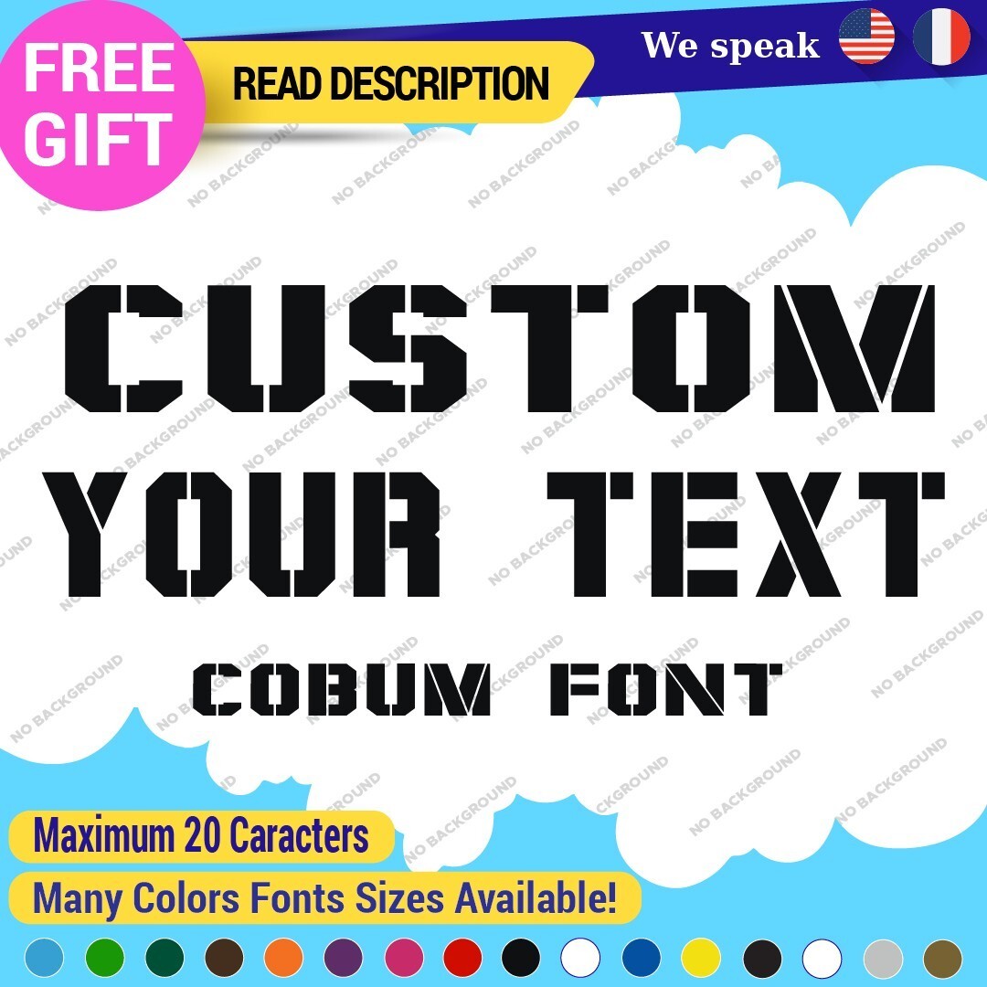 Introducing the Custom Text Name Cobum Fonts Lettering Die Cut Decal Vinyl Sticker 651, an exceptional addition to your signage needs. Priced between $8.65 and $11.65, this product offers remarkable value for a personalized touch. Crafted from high-quality Oracal vinyl, this decal is designed for durability and versatility, featuring a range of finishes including carbon fiber texture, glossy, matte, and metallic options. The die-cut design allows for custom images and text, making it ideal for personalizing vehicles, including cars, motorcycles, and trailers. With dimensions available up to 14 inches on the longest side, it fits a variety of placements such as bumpers, doors, and windows. The self-adhesive backing ensures a secure application, while the extensive color selection, from vibrant hues like red and blue to elegant metallics, allows you to tailor the decal to your style. Enjoy a 5-year manufacturer warranty, guaranteeing long-lasting satisfaction. Elevate your space with unique, customized lettering today.
