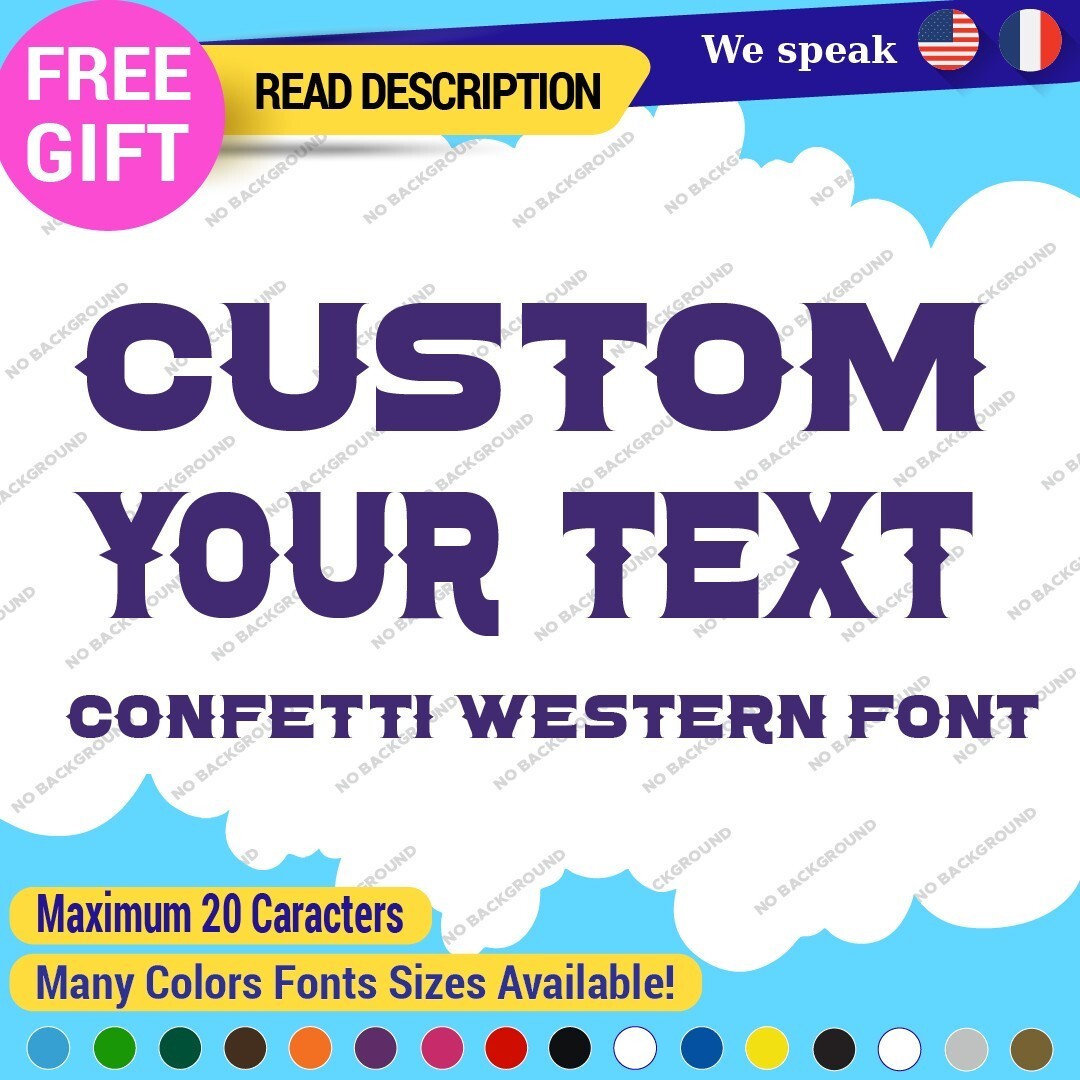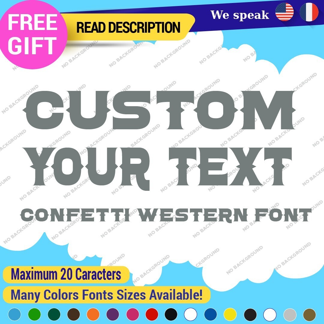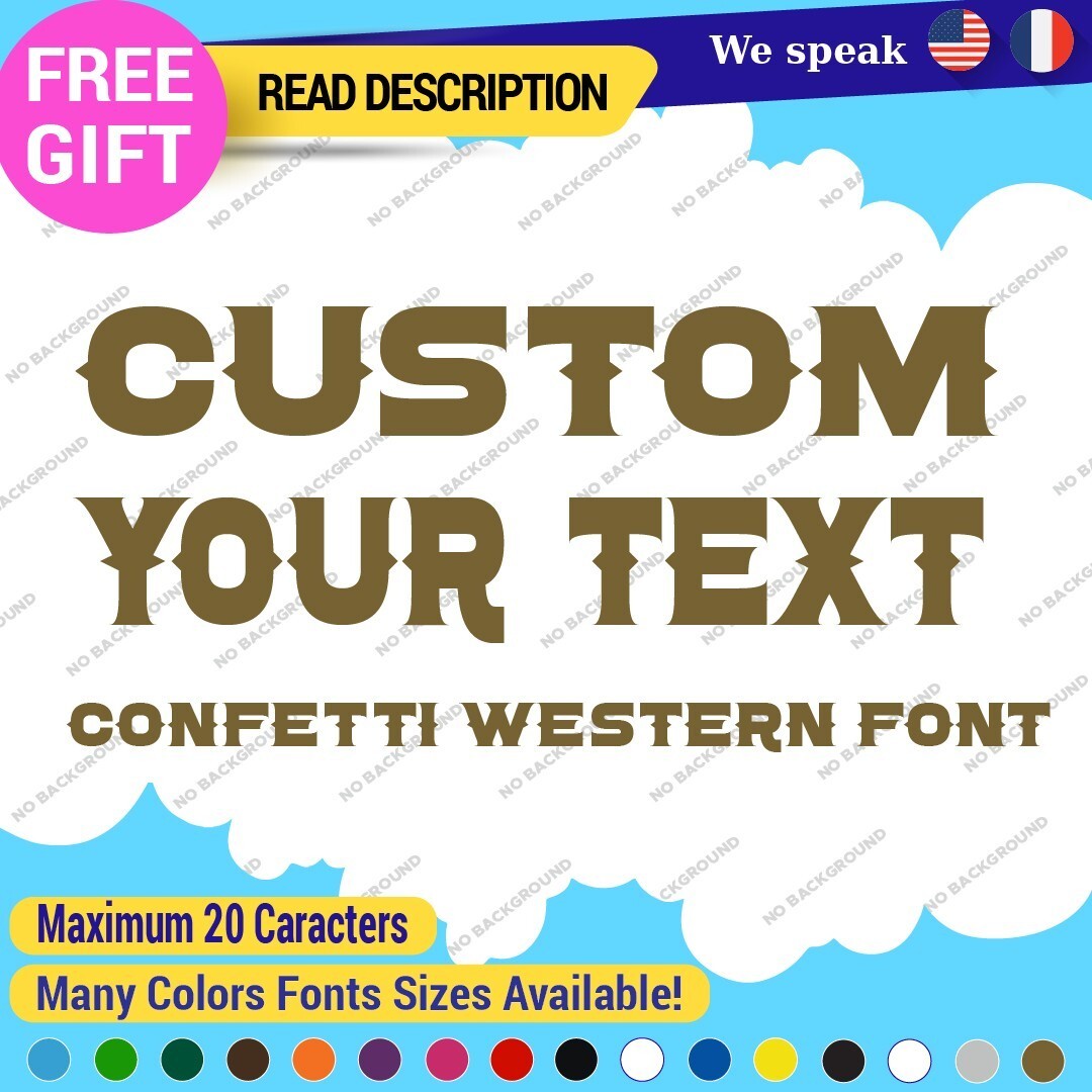 Introducing the Custom Text Name Confetti Western Font Lettering Die Cut Decal Vinyl Sticker 651, a versatile and stylish sign ideal for personalizing your vehicle or any surface. Made from high-quality Oracal vinyl, this self-adhesive decal is available in various colors and finishes, ensuring a perfect match for your aesthetic. With customizable text options, it can be placed on bumpers, windows, and more. This durable sticker comes with a 5-year warranty and is suitable for cars, motorcycles, trailers, and more. Elevate your style with this unique decal, priced between $8.65 and $11.65.