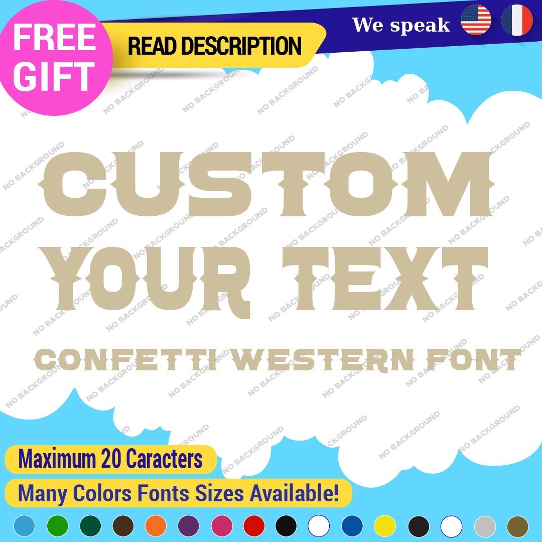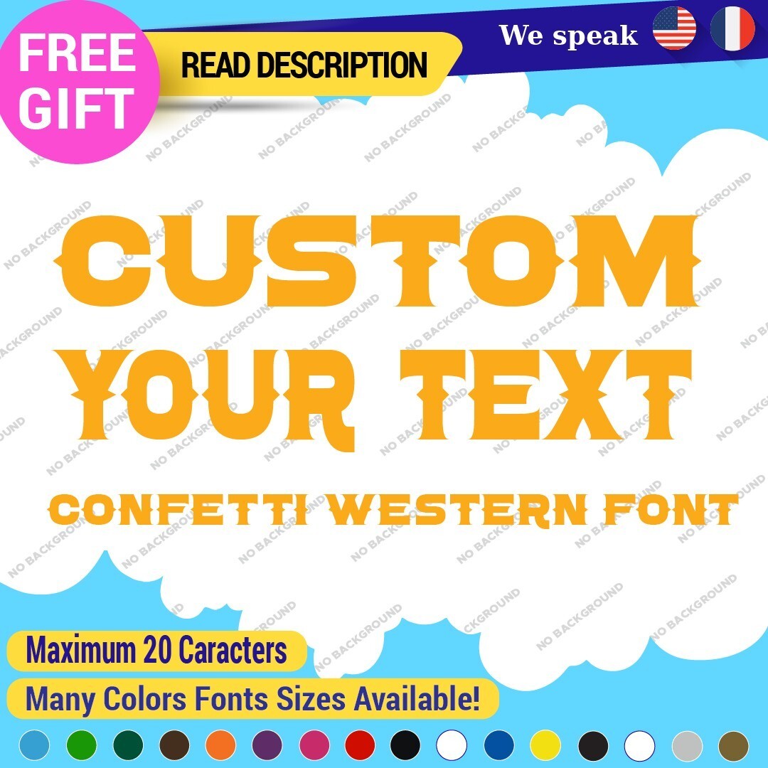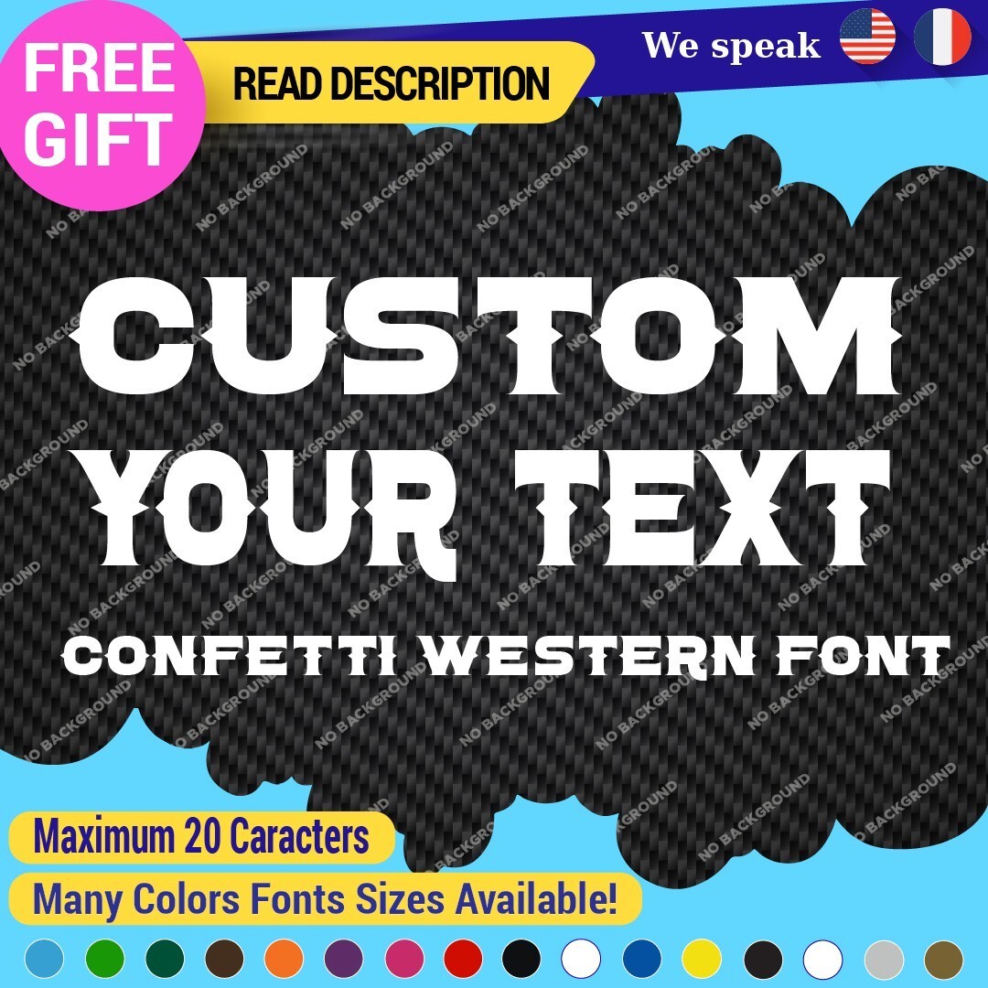 Introducing the Custom Text Name Confetti Western Font Lettering Die Cut Decal Vinyl Sticker 651, a versatile and stylish sign ideal for personalizing your vehicle or any surface. Made from high-quality Oracal vinyl, this self-adhesive decal is available in various colors and finishes, ensuring a perfect match for your aesthetic. With customizable text options, it can be placed on bumpers, windows, and more. This durable sticker comes with a 5-year warranty and is suitable for cars, motorcycles, trailers, and more. Elevate your style with this unique decal, priced between $8.65 and $11.65.
