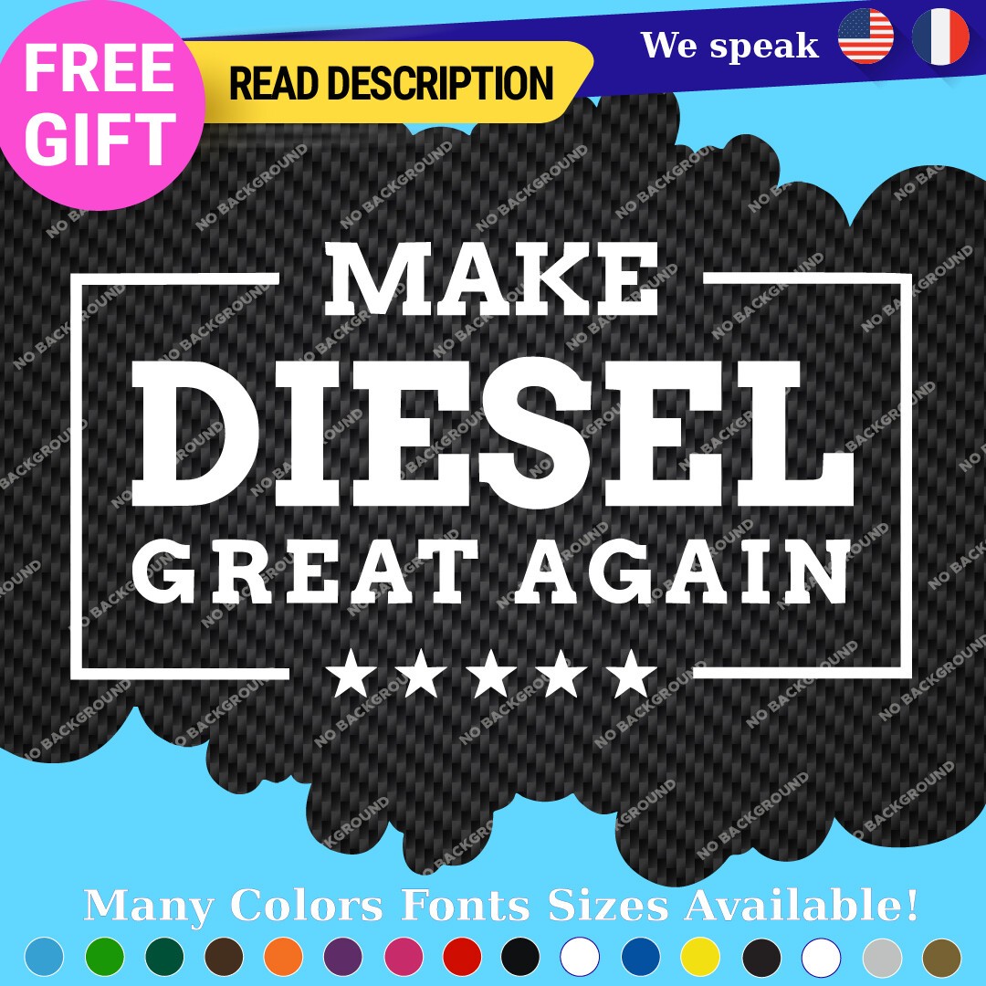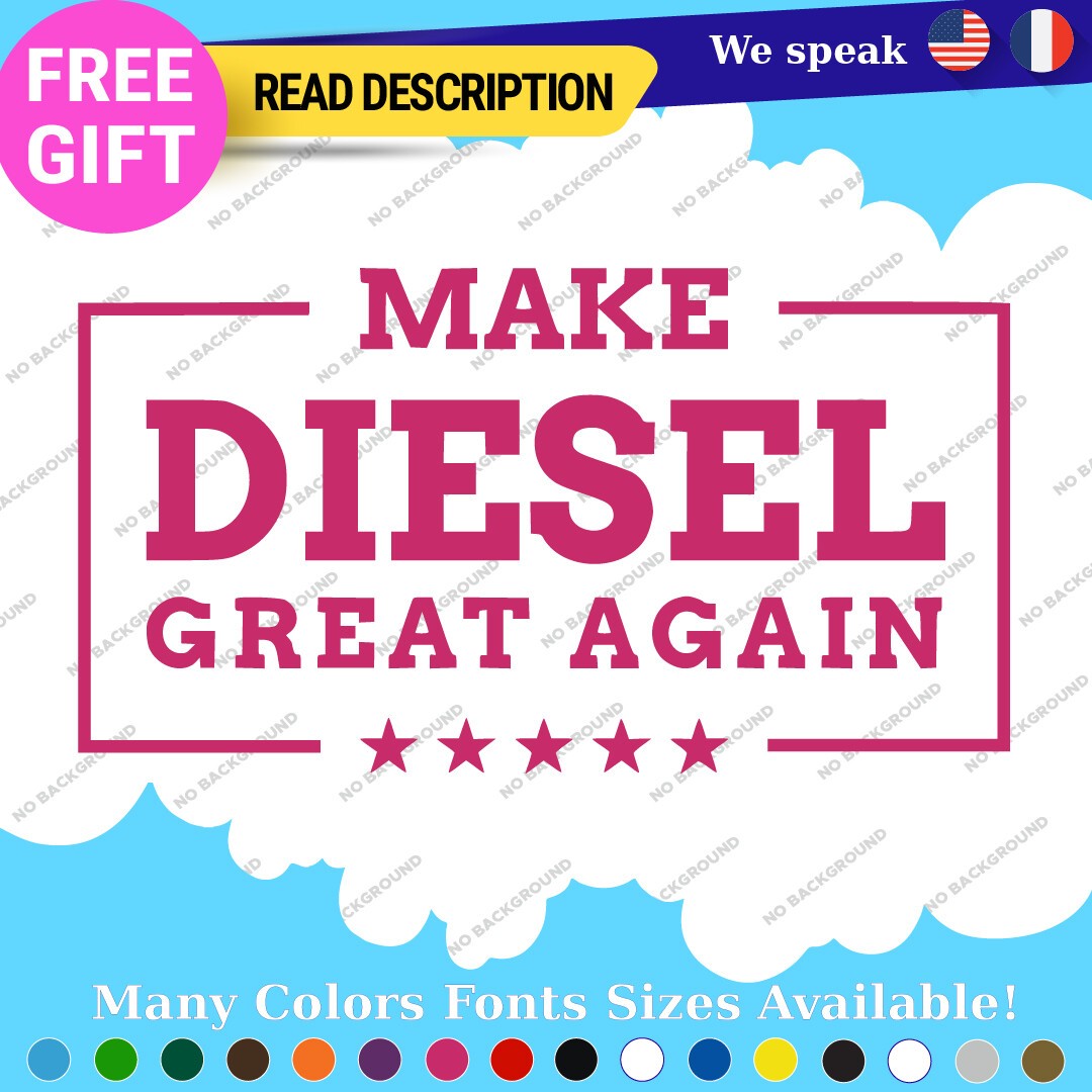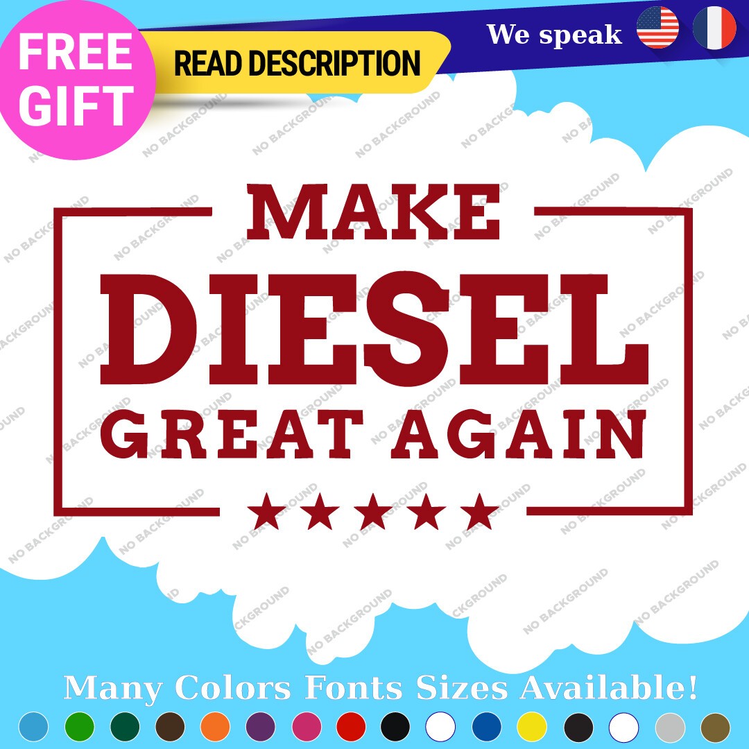 Introducing the “Make Diesel Great Again Decal Sticker,” a premium vinyl product designed specifically for diesel enthusiasts. Priced between $8.65 and $11.65, this decal is perfect for those who want to make a bold statement on their trucks or other vehicles. Crafted from high-quality Oracal vinyl, the sticker features a die-cut design that allows for a custom image and text, ensuring a unique touch to your vehicle. With a versatile placement range, it can be affixed to various surfaces including bumpers, windows, fuel tanks, and more. The decal comes in multiple finishes such as glossy, matte, and metallic, allowing you to choose the perfect look for your vehicle. Available in an array of colors including black, white, red, blue, and many others, it ensures a match for every aesthetic. Constructed for durability with a 5-year warranty, this decal is suitable for cars, motorcycles, trailers, and more, making it a universal fit for all diesel lovers.
