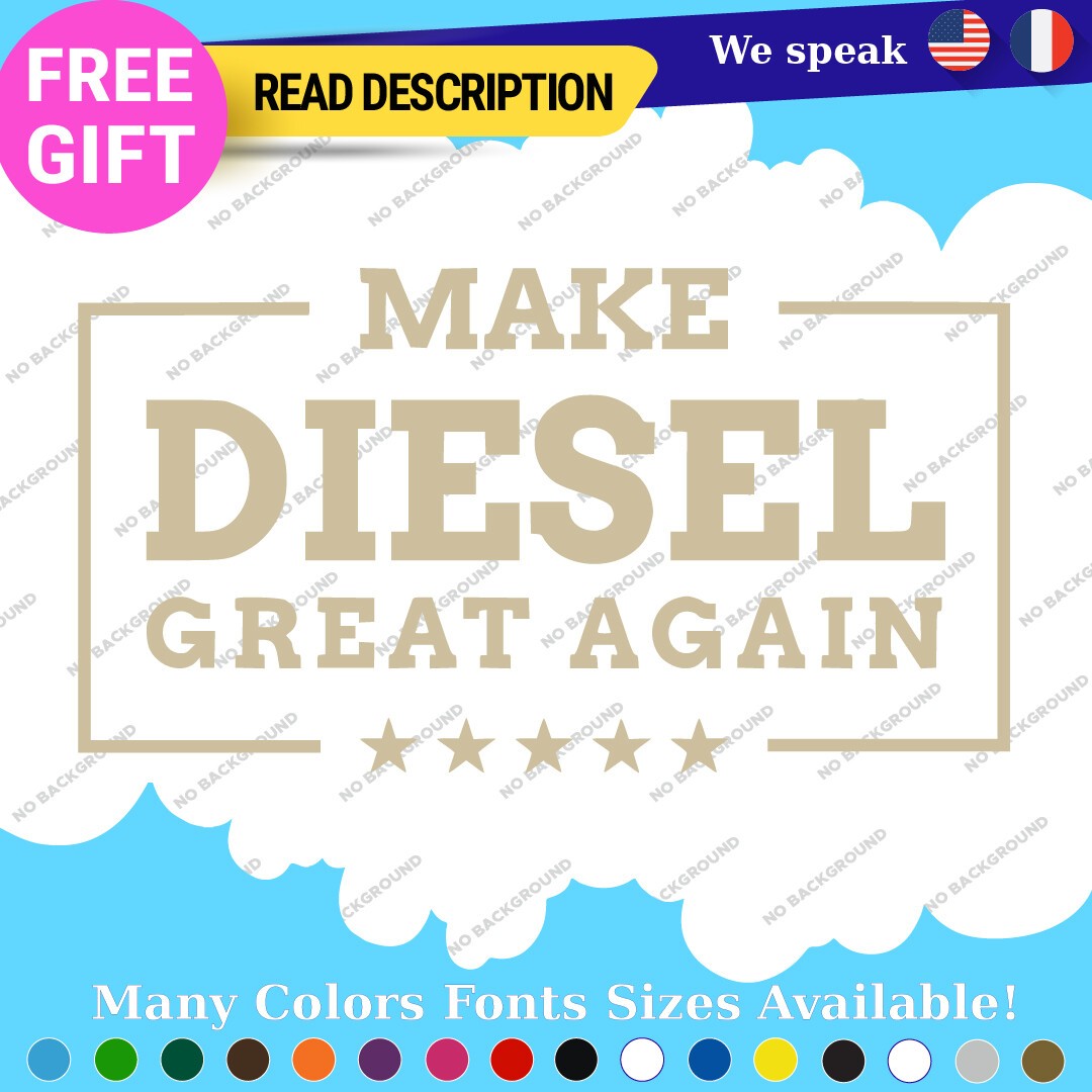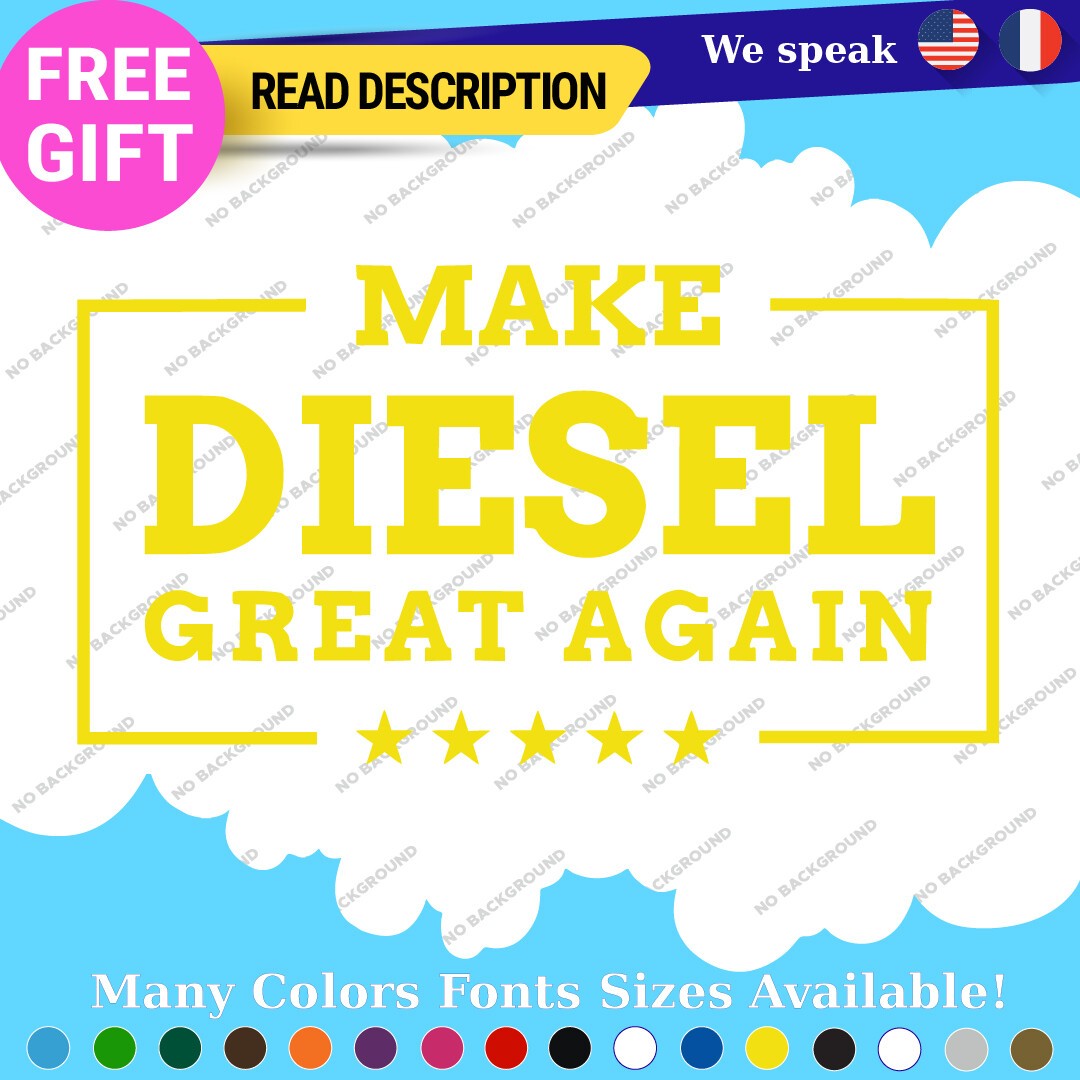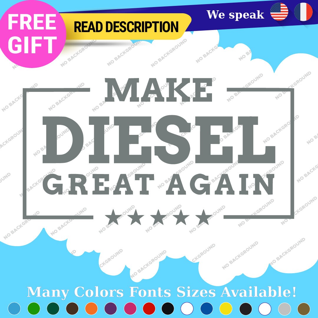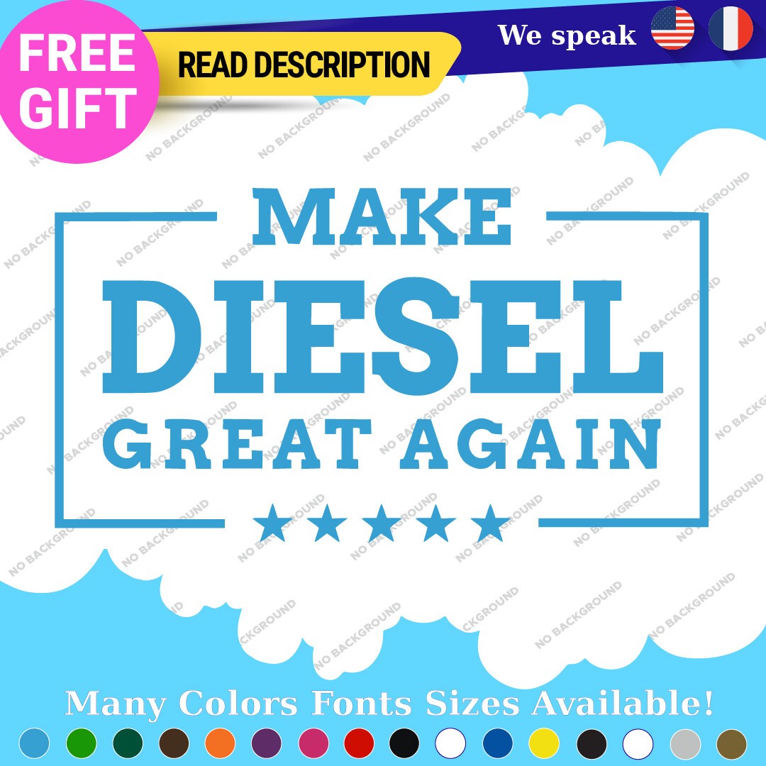 Introducing the “Make Diesel Great Again Decal Sticker,” a premium vinyl product designed specifically for diesel enthusiasts. Priced between $8.65 and $11.65, this decal is perfect for those who want to make a bold statement on their trucks or other vehicles. Crafted from high-quality Oracal vinyl, the sticker features a die-cut design that allows for a custom image and text, ensuring a unique touch to your vehicle. With a versatile placement range, it can be affixed to various surfaces including bumpers, windows, fuel tanks, and more. The decal comes in multiple finishes such as glossy, matte, and metallic, allowing you to choose the perfect look for your vehicle. Available in an array of colors including black, white, red, blue, and many others, it ensures a match for every aesthetic. Constructed for durability with a 5-year warranty, this decal is suitable for cars, motorcycles, trailers, and more, making it a universal fit for all diesel lovers.
